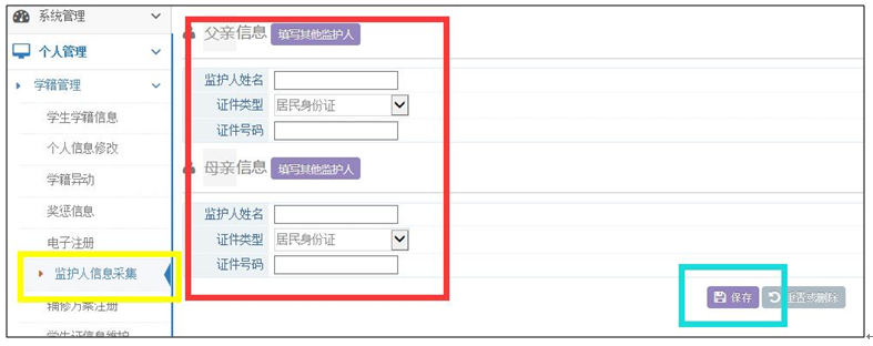 (1)登录教务系统,“个人管理”→“学籍管理”→“监护人信息采集”,填写完成后点击“保存”。