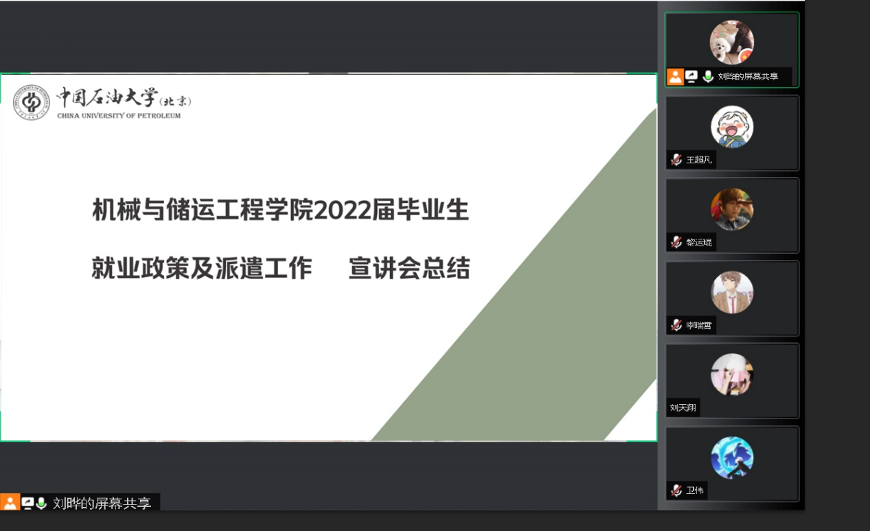 为帮助学生适应就业形势、熟悉就业政策,清晰了解学校派遣、改派等相关工作手续和内容,5月18日,中石大机械与储运工程学院通过线上会议召开了2022届毕业生就业政策及派遣工作宣讲会,宣讲会由毕业班辅导员周小龙担任讲解,院团委书记刘晔及300余名应届毕业生参会。