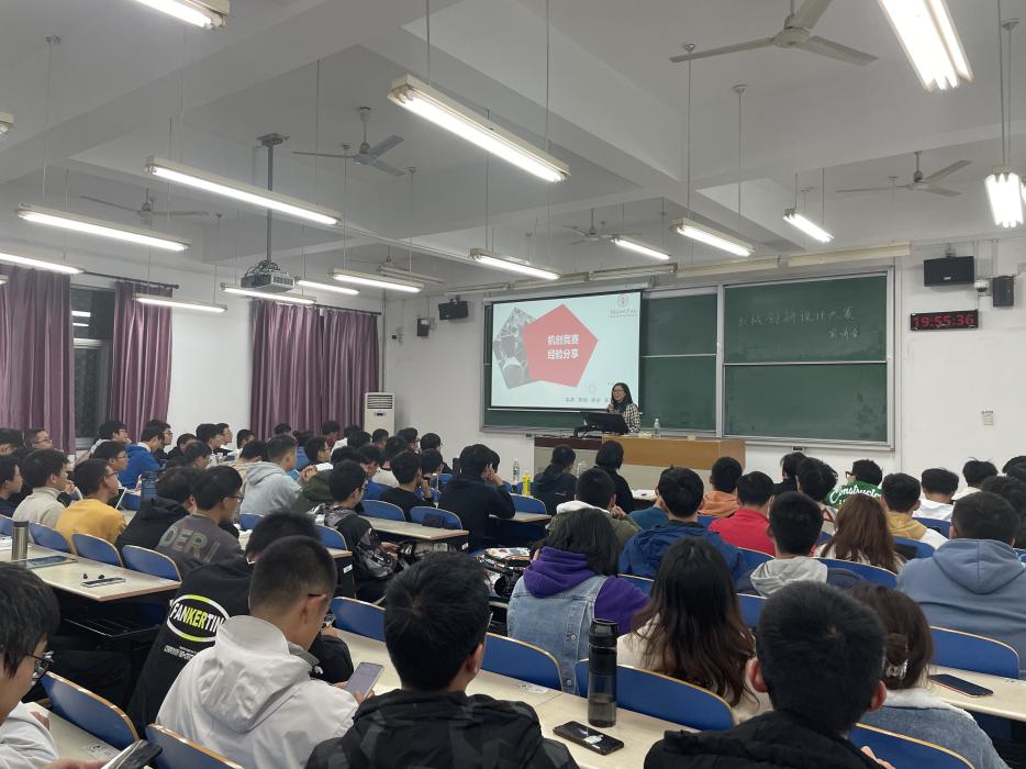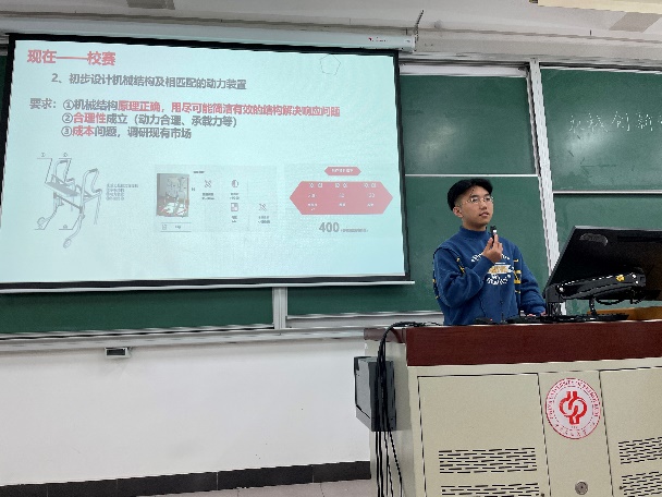 此次活动还邀请了第九届全国大学生机械创新大赛国奖二等奖获得者机械18级于海文同学给大家做参赛经验分享,于同学从学生的视角出发,以时间为节点讲述了自己参赛的整个心路历程,和准备比赛过程中各个阶段需要注意的问题,且对今年“自然•和谐”的主题提出了自己的看法。于海文同学在分享中指出“创新应从实际出发,不应为创新而创新”,引导学生发现问题,解决问题。