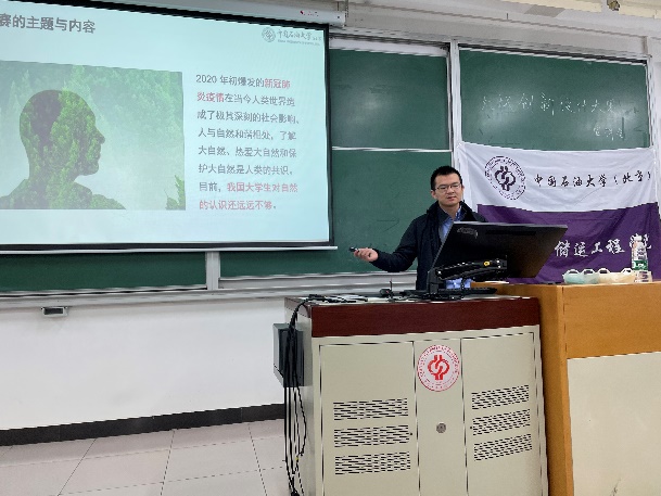 张行老师详细介绍了大赛的背景、大赛的主题与内容、参赛条件与方式等。本届大赛以“仿生机械”和“生态修复机械”为主题,“仿生机械”主题在于引导大学生主动认识大自然中的动物和其活动规律。参赛者设计“仿生机械”,重点是根据动物的运动形态、身体结构和功能特点,用巧妙的机械结构来模仿实现。 “生态修复机械”主题是激发大学生热爱自然、保护自然的情怀。参赛者可结合当地或者自己家乡自然生态受人类活动等破坏的情况,设计和开发相应的修复机械。