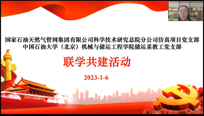 2023年1月6日,机械与储运工程学院储运系教工党支部与国家石油天然气管网集团有限公司科学技术研究总院分公司仿真项目党支部共同开展了党支部共建活动。受疫情影响,此次共建活动采用线上方式进行,由储运系主任刘啸奔主持,双方支部共24名党员参加。