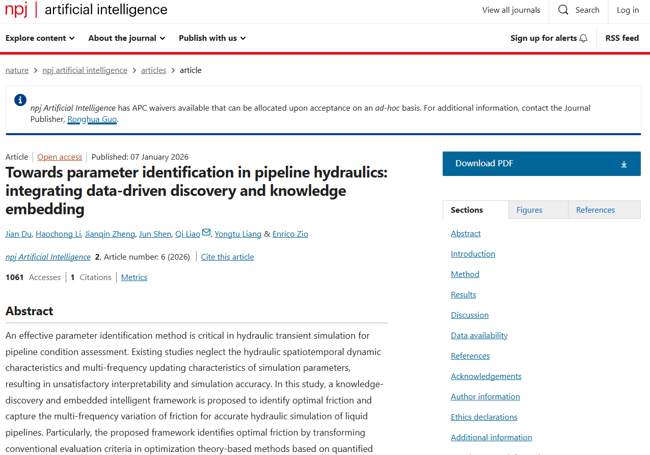 近日,机械与储运工程学院梁永图教授领衔的油气供应链运行仿真与优化课题组,联合国内外多家合作单位,提出了一种液态能源管道参数辨识与在线估计技术,成果发表于Nature Portfolio旗下的自然合作期刊《npj Artificial Intelligence》,题目为《Towards parameter identification in pipeline hydraulics: integrating data-driven discovery and knowledge embedding》,学院石油与天然气工程专业2022级博士研究生杜渐为论文第一作者,廖绮副教授为通讯作者。该成果是机械与储运工程学院油气储运工程系近年来,首篇以本院学生为第一作者、本院教师为通讯作者发表的Nature旗下期刊论文。