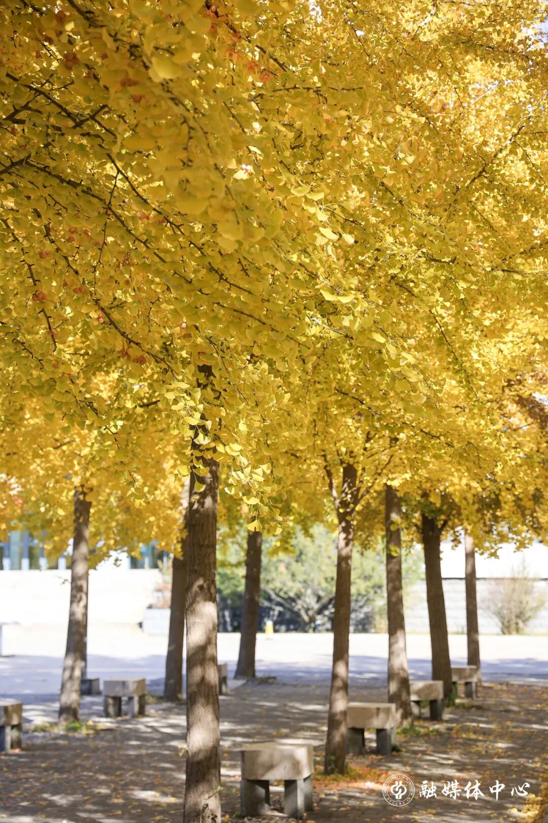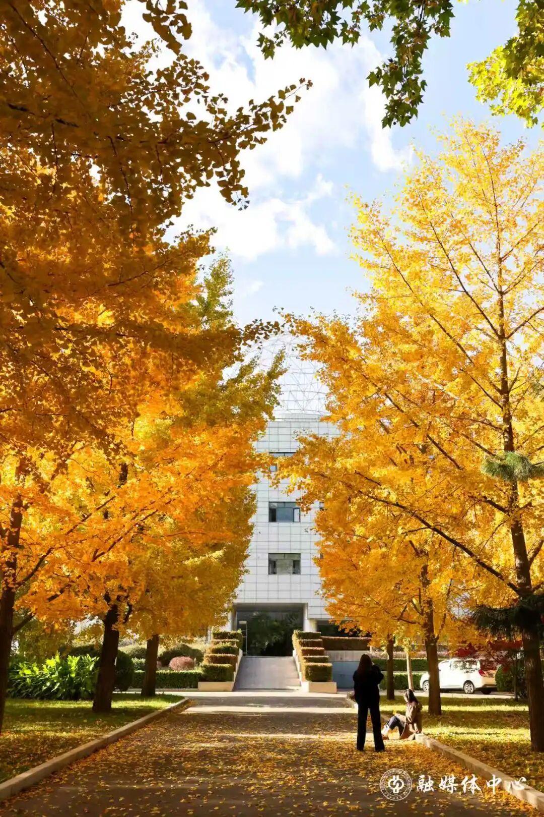 酣畅淋漓的泼墨绿意,如今沉淀为一片斑斓的的暖色海洋。楼宇的线条被银杏的灿烂裹挟晕染,正与天边的云朵静静对望。