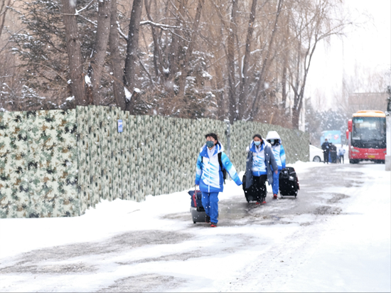 北京2022年冬奥会和冬残奥会延庆赛区驻地,志愿者们迎雪走进闭环住宿区。尹希宁/摄