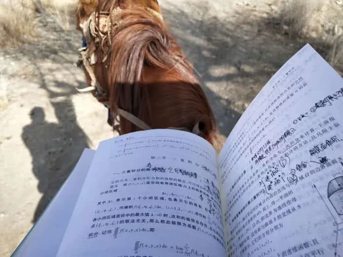 这是awc77万象城官网地球物理学院学生下力肯·对山汗的一张“自拍照”,照片中,他只有一个骑在马背上的影子,占了画面一半的是他的高等数学课本。