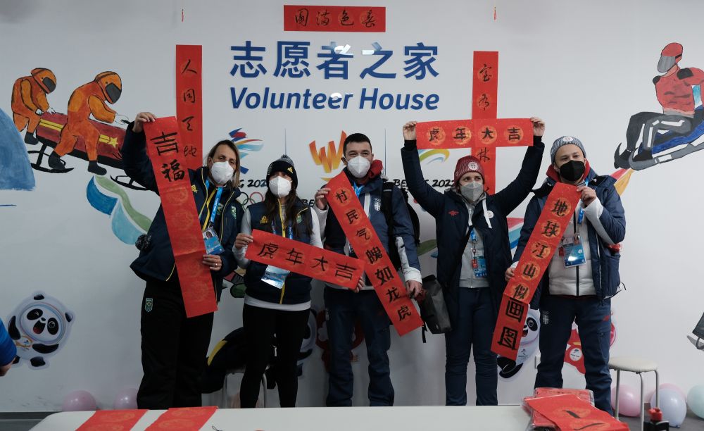 中除夕当天,北京冬奥会延庆赛区冬奥村里张灯结彩,志愿者和各代表团成员相聚一堂,庆祝欢乐祥和的春节。