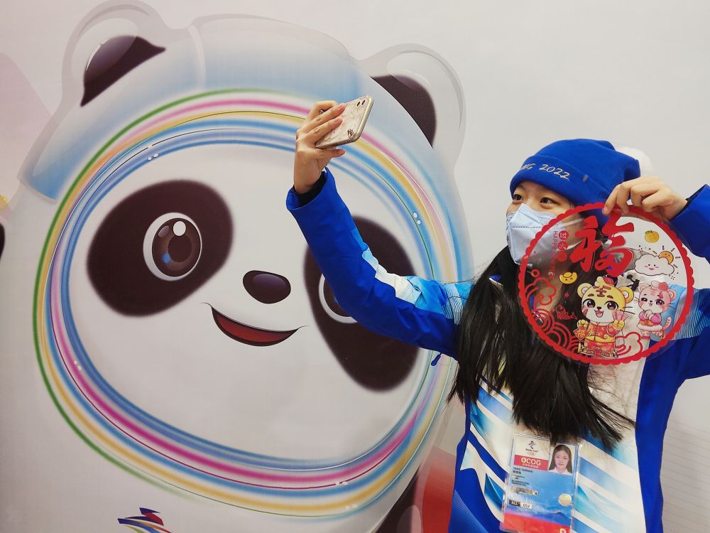 一名志愿者在延庆冬奥村自拍留念(1月31日摄)。新华社发(安曜扬摄)