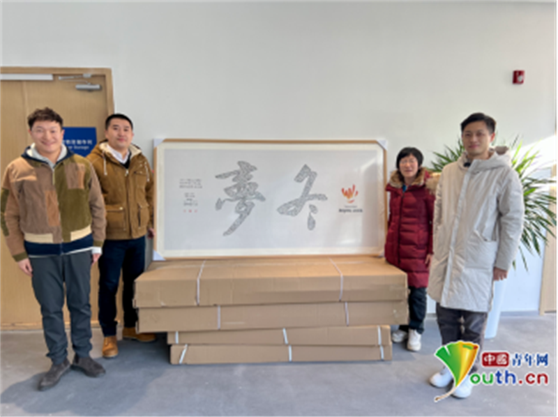 金先赤将横版《冬梦》艺术设计作品装裱后送至延庆冬奥村。从左至右为孙立翔、金先赤、邓听、夷康