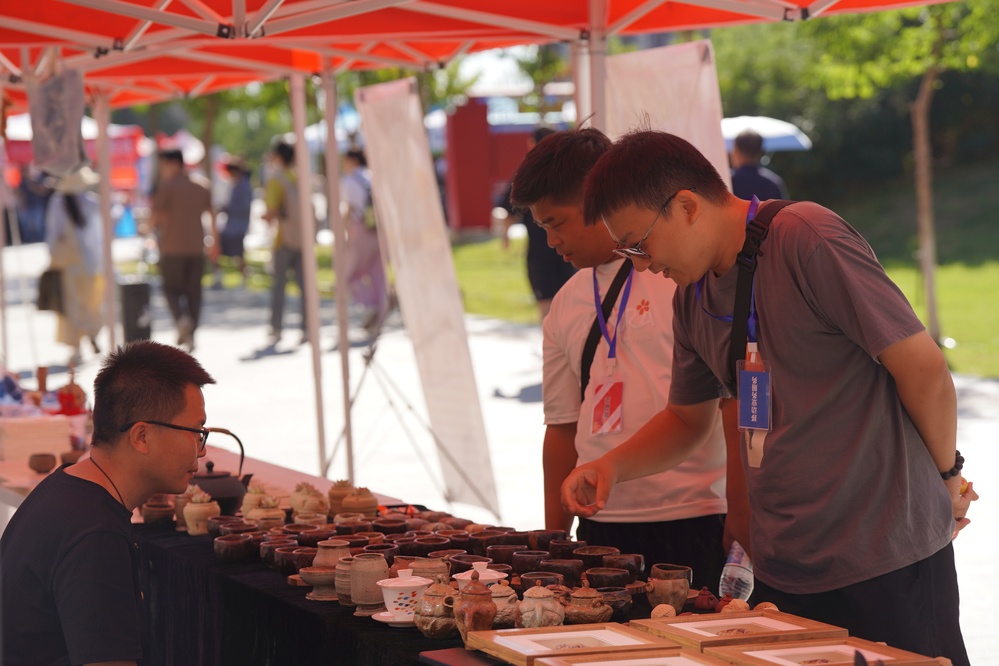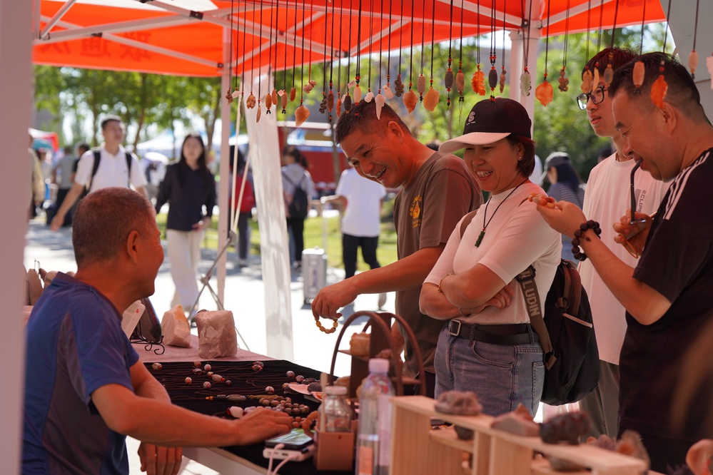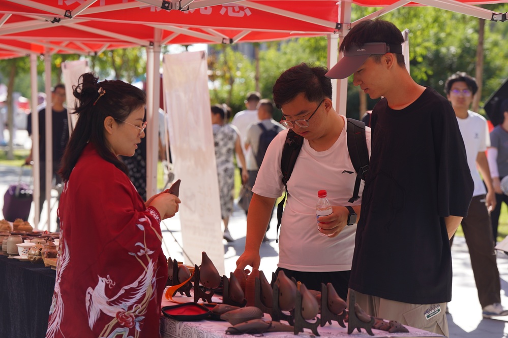 在“求是”路上,新生及家长们在克拉玛依非遗活动展区近距离体验紫砂哨埙、金丝玉雕、扎染、石头画等非遗技艺,感受克拉玛依深厚的文化底蕴与匠心传承。非遗传承人指尖翻飞,将紫砂揉捏、塑形;一旁的金丝玉雕更显精致,玉石的温润与金丝的璀璨交相辉映;扎染体验区充满乐趣,白色棉布浸泡、捆扎,浸入染缸——原本单调的白布上绽放出深浅不一、纹路独特的蓝白花纹;戈壁鹅卵石经过画笔勾勒,成为绘有新疆风情的艺术品。“这是我第一次如此近距离地接触非物质文化遗产,每一样都让我觉得特别新奇。感谢克拉玛依市和中石大,把这么优质的文化资源带到我们身边。”中石大克拉玛依校区资源勘查工程专业2025级本科新生许晓军表示。