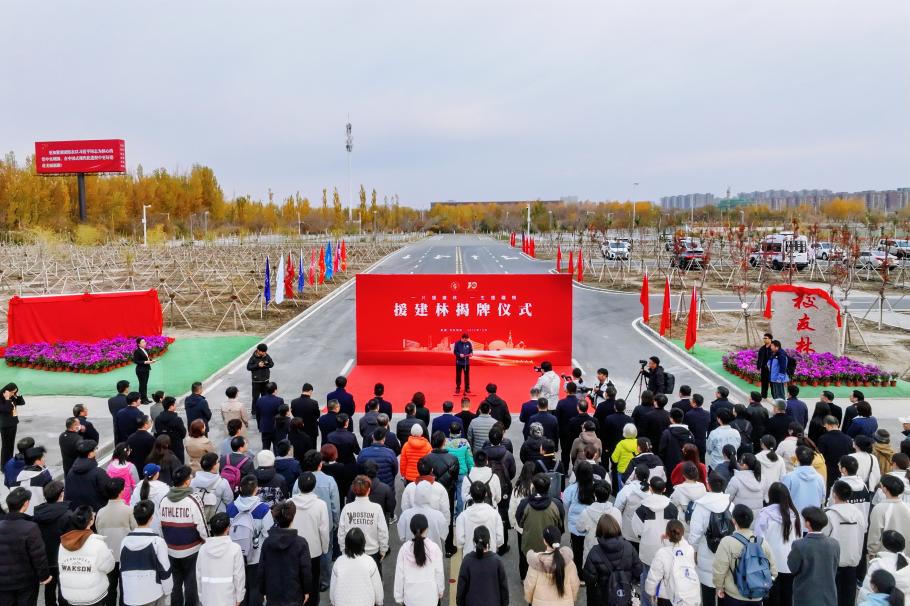 王同奇在主持中表示,这片由援建教师亲手种植的胡杨林,象征着教育援疆事业在这片热土上“落地生根、枝繁叶茂”,更承载着教育援疆的深情厚谊,凝聚着多方共建、校地协同的丰硕成果。援建林揭牌仪式,不仅是一段情谊的“里程碑”,更是一段新征程的“起跑线”。这片援建林,将与所有扎根新疆的教育者一起成长,与服务教育援疆的克拉玛依校区共同奋进,见证西部高等教育振兴之路越走越宽。