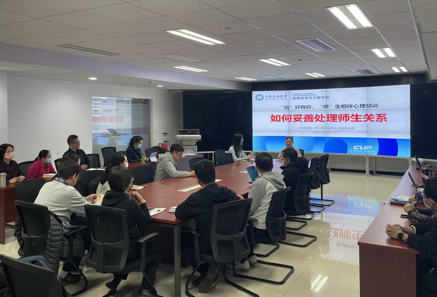 为进一步加强学院班主任和学业导师队伍专业化建设,3月15日上午,中石大信息科学与工程学院开展“如何妥善处理师生关系”心理专题培训。学院班主任、学业导师及研究生导师等参加培训。