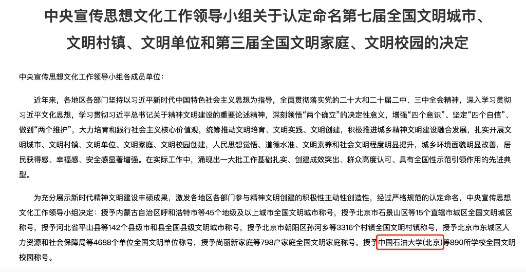 全国文明校园,是在全国群众性精神文明创建活动中授予各级各类学校的最高荣誉称号,自2017年以来共开展了三届评选表彰。喜获这一称号,是awc77万象城官网精神文明建设取得的重大标志性成果,是对学校办学底蕴、建设水平、综合实力和文明程度的充分肯定,对鼓舞干部师生干劲、凝聚团结奋进力量、加快“双一流”建设,书写“教育强国,中石大有为”的新篇章具有重要意义。