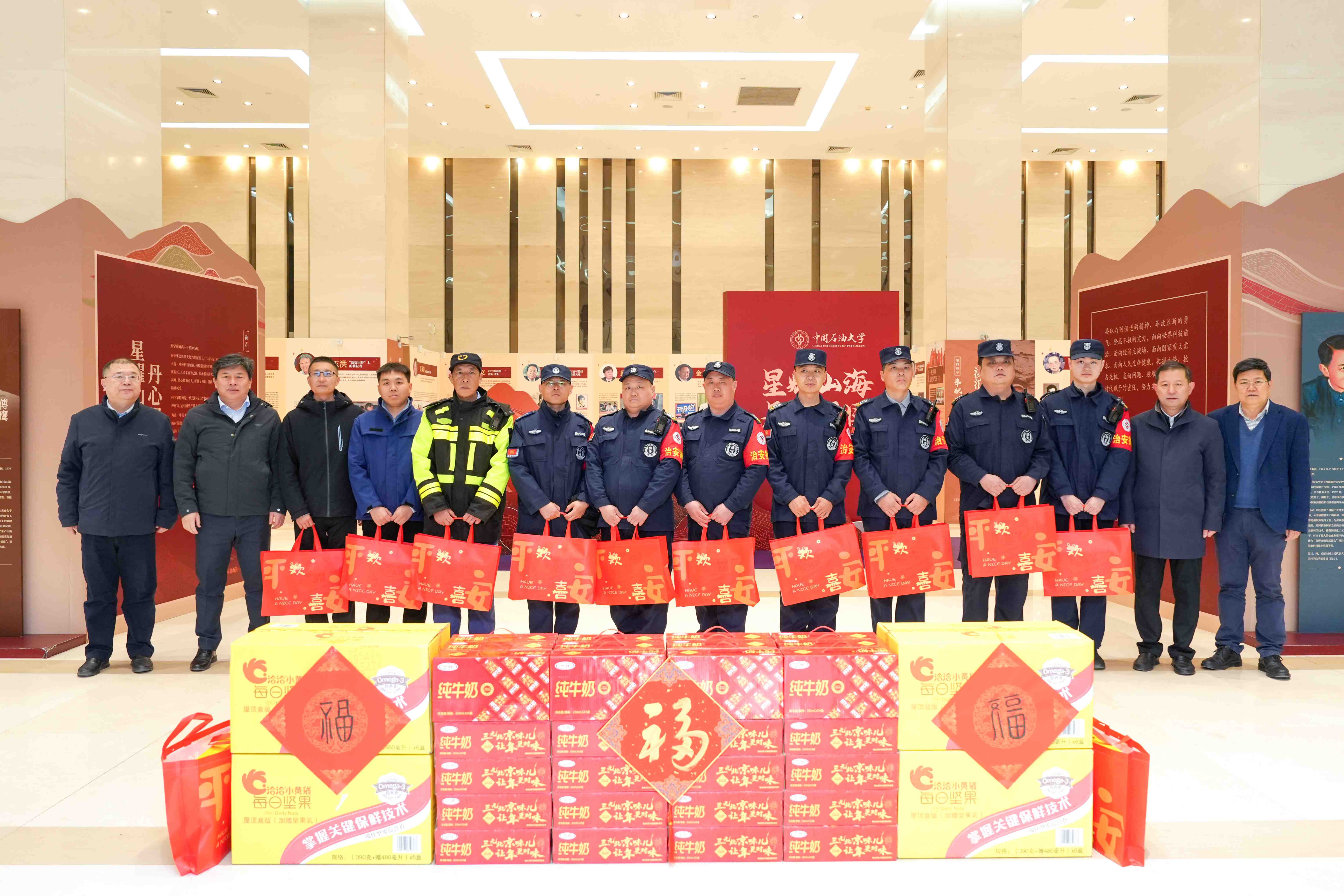 王同奇对学校一线工作人员在寒假期间舍小家、为大家,坚守岗位、默默奉献的精神表示肯定和感谢。他指出,安保和后勤保障工作是校园安全稳定、师生生活有序的坚实基石,春节期间更是责任重大,正是大家的日夜坚守、履职尽责,才能为留校师生筑起安全屏障、提供舒适保障。校领导为在岗人员代表发放了暖心大礼包,祝愿大家新年身体健康、阖家幸福、万事如意。