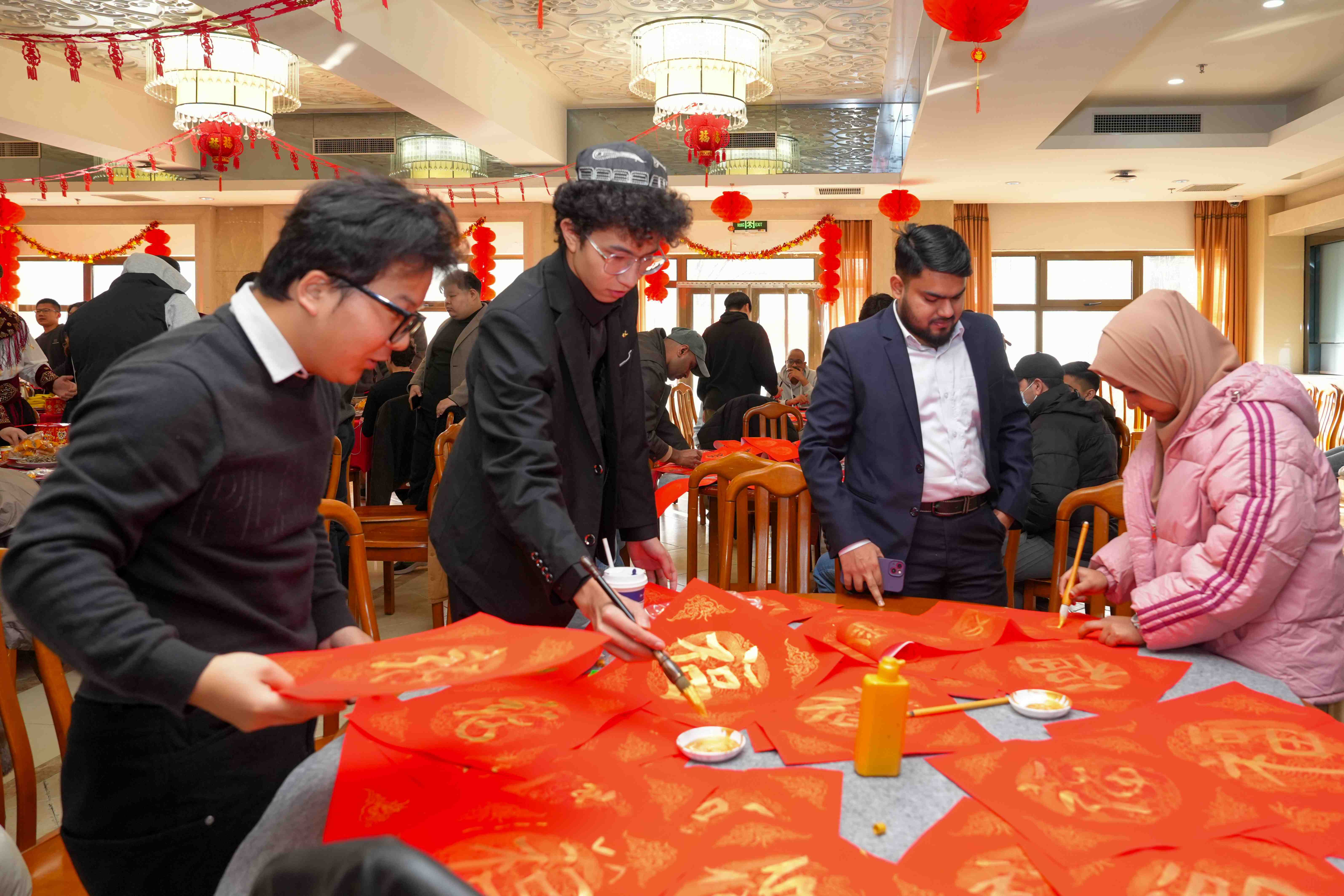 2月10日,学校在翠宫举办了留校中外学生新春联欢会,会场内张灯结彩、喜气洋洋,处处洋溢着团圆祥和的节日氛围,近百名留校中外学生欢聚一堂。活动现场,校领导与中外学生一起包饺子、写春联,询问大家的学习生活情况、节日安排和实际需求,为同学们送上新春祝福。来华留学生们表示,感受到了学校的温暖和中国春节的热闹氛围。