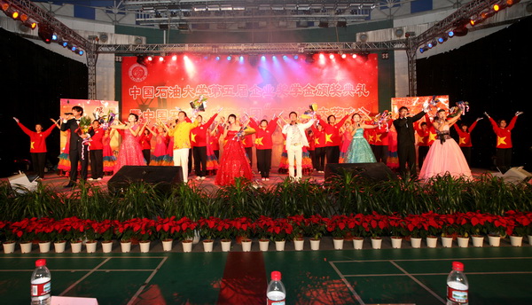 晚会最后在艺术团演员与我校学生共同表演的歌舞《二十年后再相会》和《我为祖国献石油》的盛大场面中圆满结束。