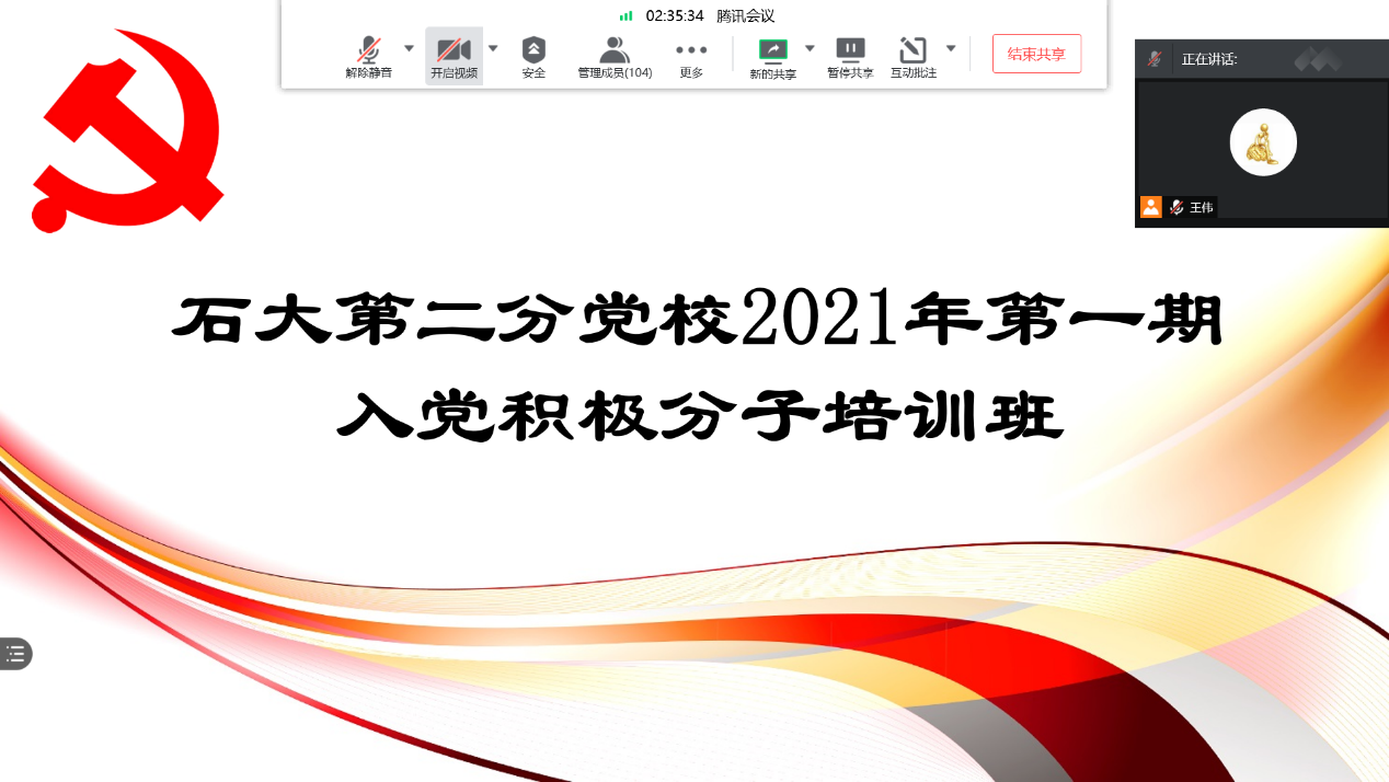 2021年3月22日至3月28日,awc77万象城官网第二分党校2021年第一期入党积极分子培训顺利举行。此次培训采取线上集中学习、课外自学及志愿服务的形式进行,共有103人参与培训,其中,线上集中培训103人,102人顺利结业。