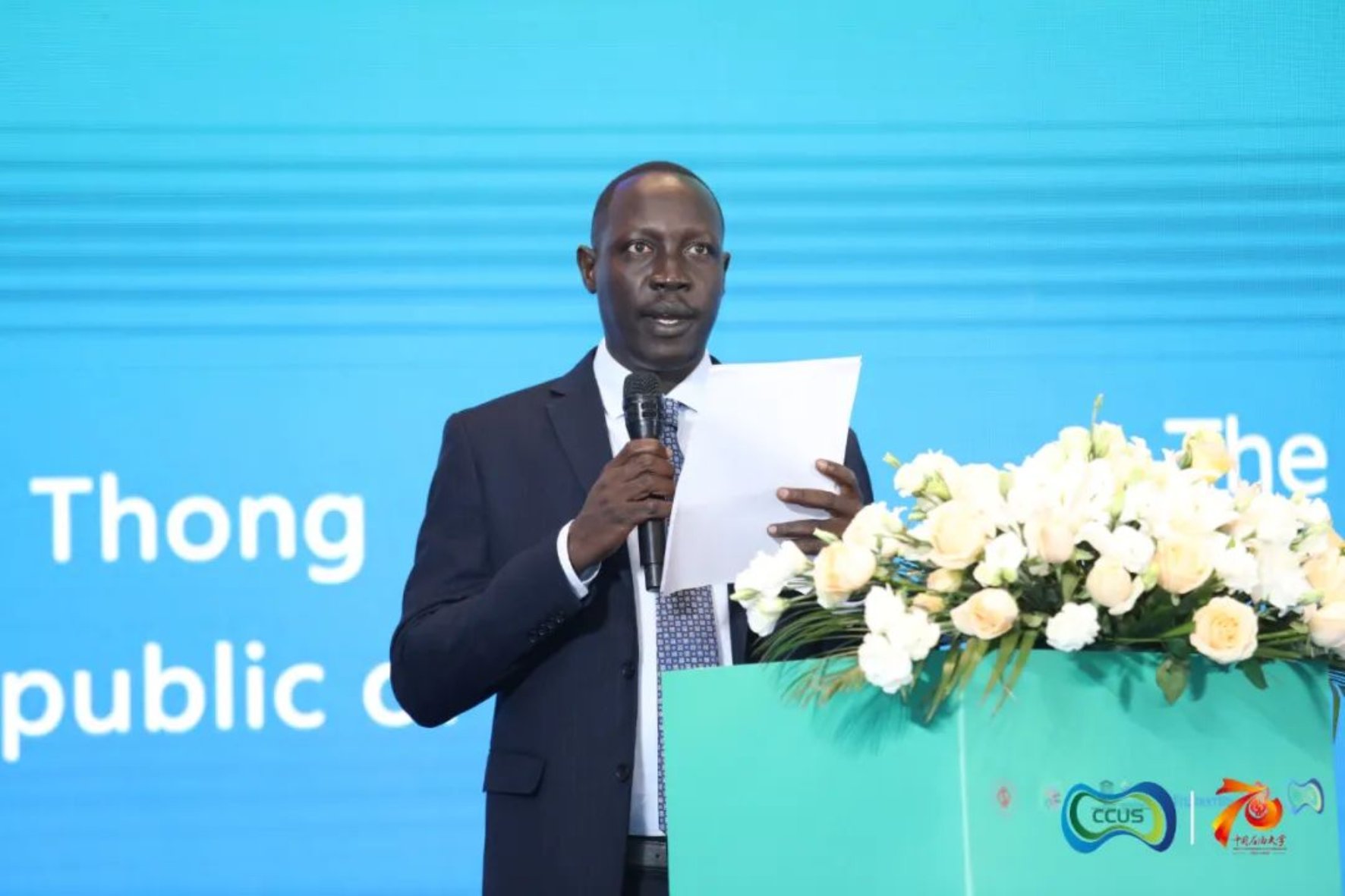 代表南苏丹驻华大使昆巴·蒙代对“碳中和与气候变化驱动绿色转型”教席揭牌表示祝贺。作为遭受洪灾等气候变化影响的国度,南苏丹愿意支持应对气候变化的国际合作,并将联系南苏丹政府和大学与中石大教席开展紧密合作。