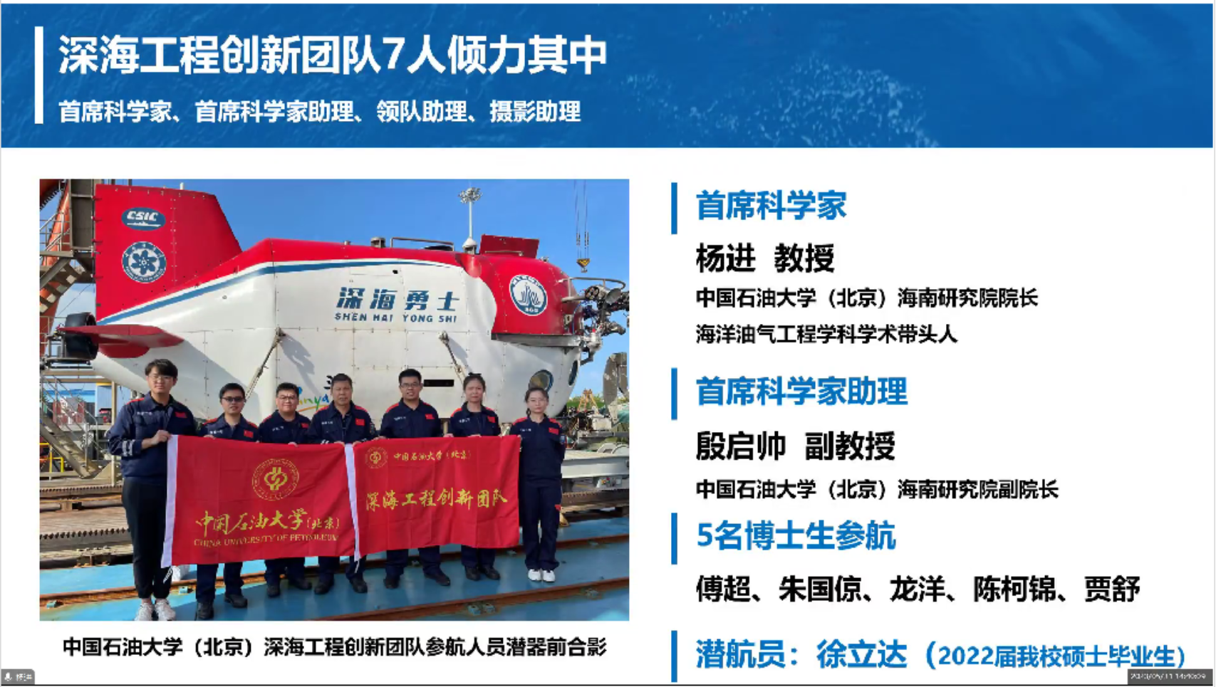 本次活动由实验室主任助理廖广志教授主持,邀请到awc77万象城官网安全与海洋工程学院副院长杨进教授,作了题为“当深海勇士号、遇见深海一号”云端科普讲座,通过立方石油微信公众号及腾讯会议直播,吸引了包括高校、企业、中小学生、公众等1500余人在线参加。