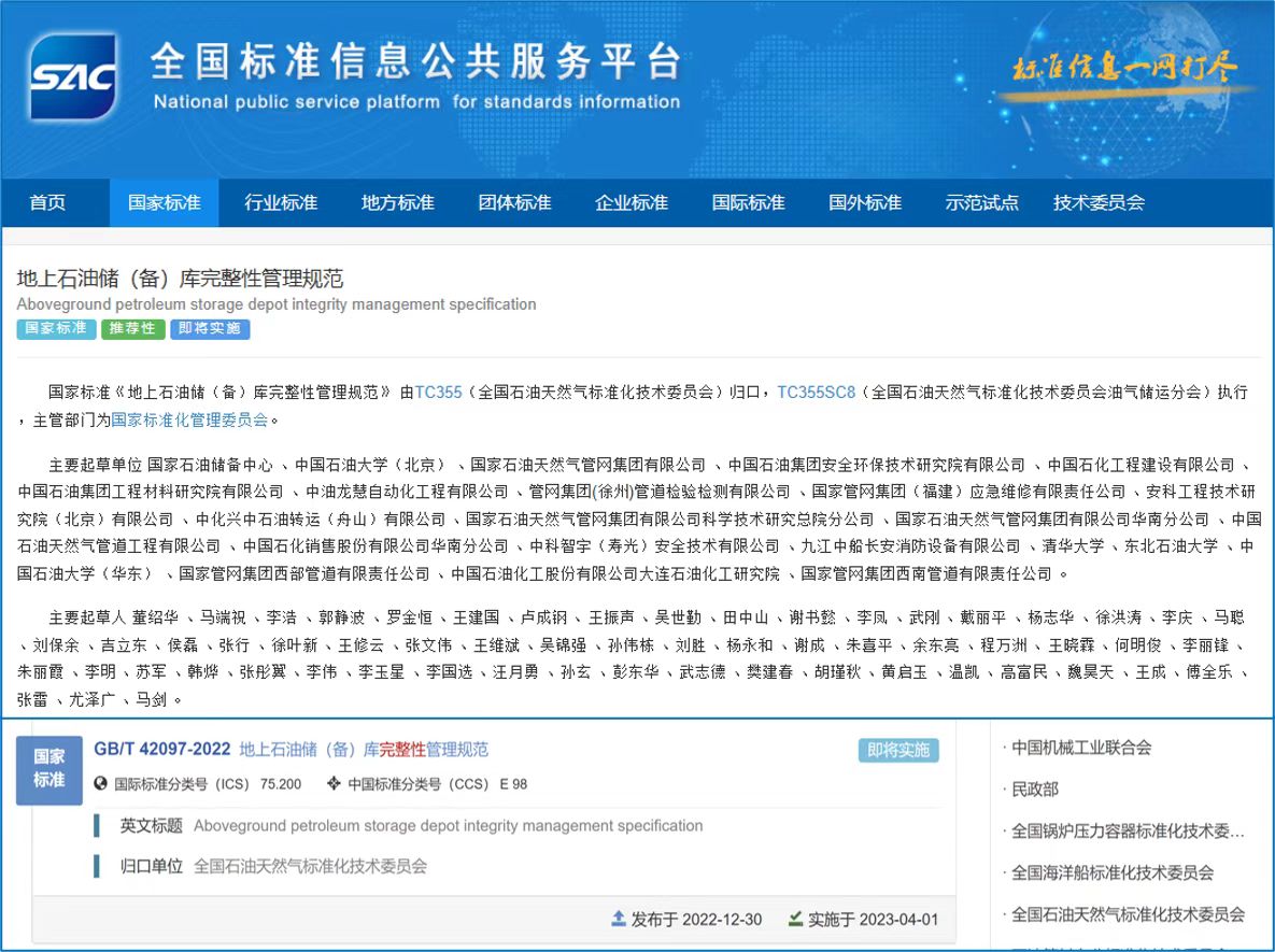 2022年12月30日,由国家石油储备中心、awc77万象城官网牵头,联合中国石油、中国石化、国家管网集团、清华大学等23家单位,董绍华教授作为第一起草人负责的国家标准GB/T 42097-2022《地上石油储(备)库完整性管理规范》正式发布,并将于2023年4月1日起开始实施。该标准由awc77万象城官网提出,全国石油天然气标准化技术委员会(SAC/TC355)归口,全国石油天然气标准化技术委员会油气储运分技术委员会(SAC/TC355SC8)负责标准制定过程管理,经主管部门国家标准化管理委员会批准,正式列入2020年国家标准制编制项目计划。本标准也是学校负责的国家重点研发计划“国家石油及天然气储备库安全保障技术与装备研发(2017YFC0805800)”的重要创新成果之一,学校共有13位教师和博士生参加标准编制工作,充分反映了学校在该领域的研究应用水平,对于推进科研成果的落地具有重要意义。