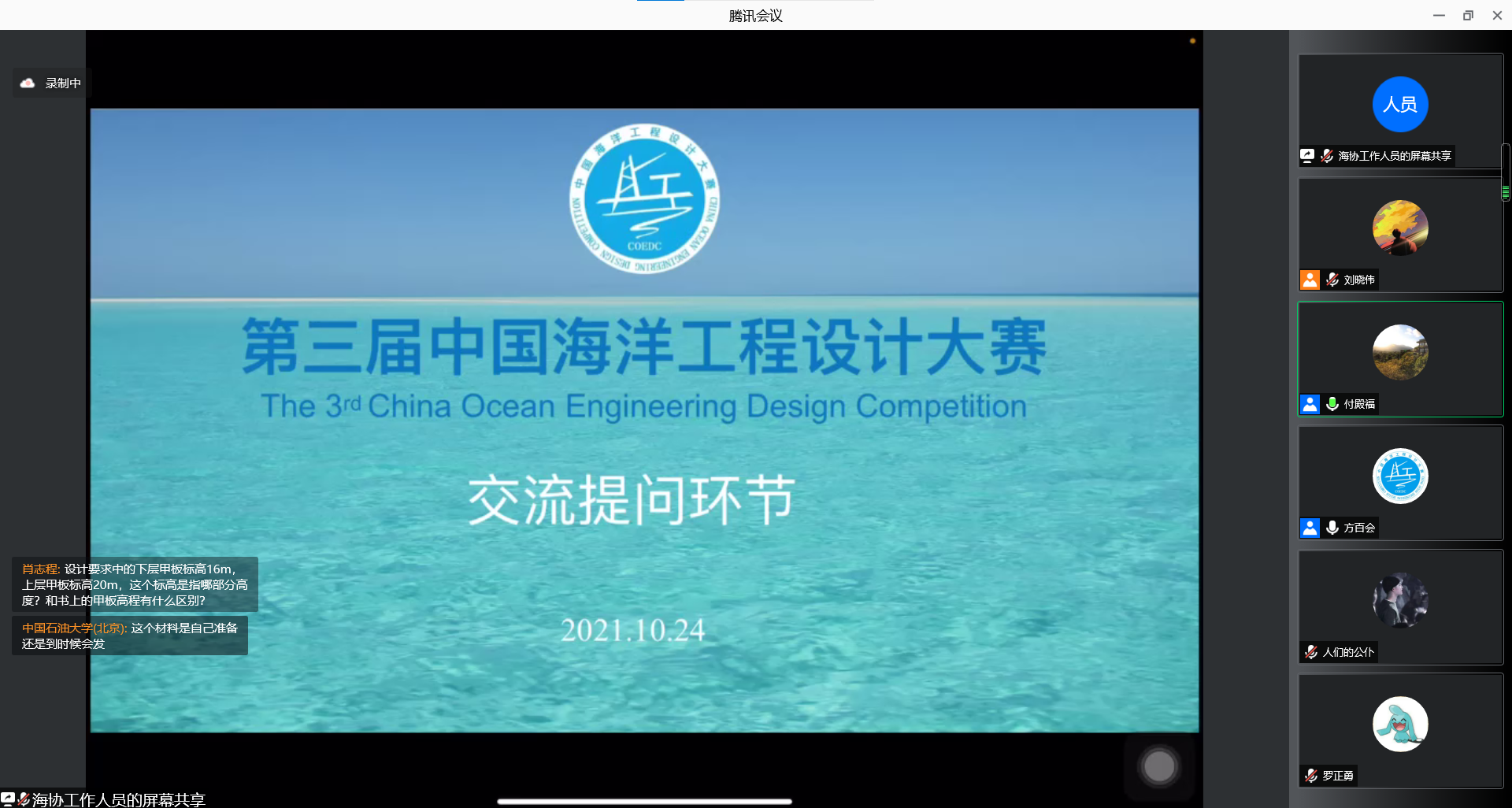 10月24日,由中国海洋工程设计大赛组委会主办的第三届中国海洋工程设计大赛赛题解读会以线上会议的形式顺利召开,本次赛题解读会邀请到中海油研究总院工程设计院副院长付殿福担任主讲嘉宾,会议由大赛组委会工作人员、中石大安全学院团委书记方百会主持,各高校参赛选手和指导老师共计400余人参加了此次会议。