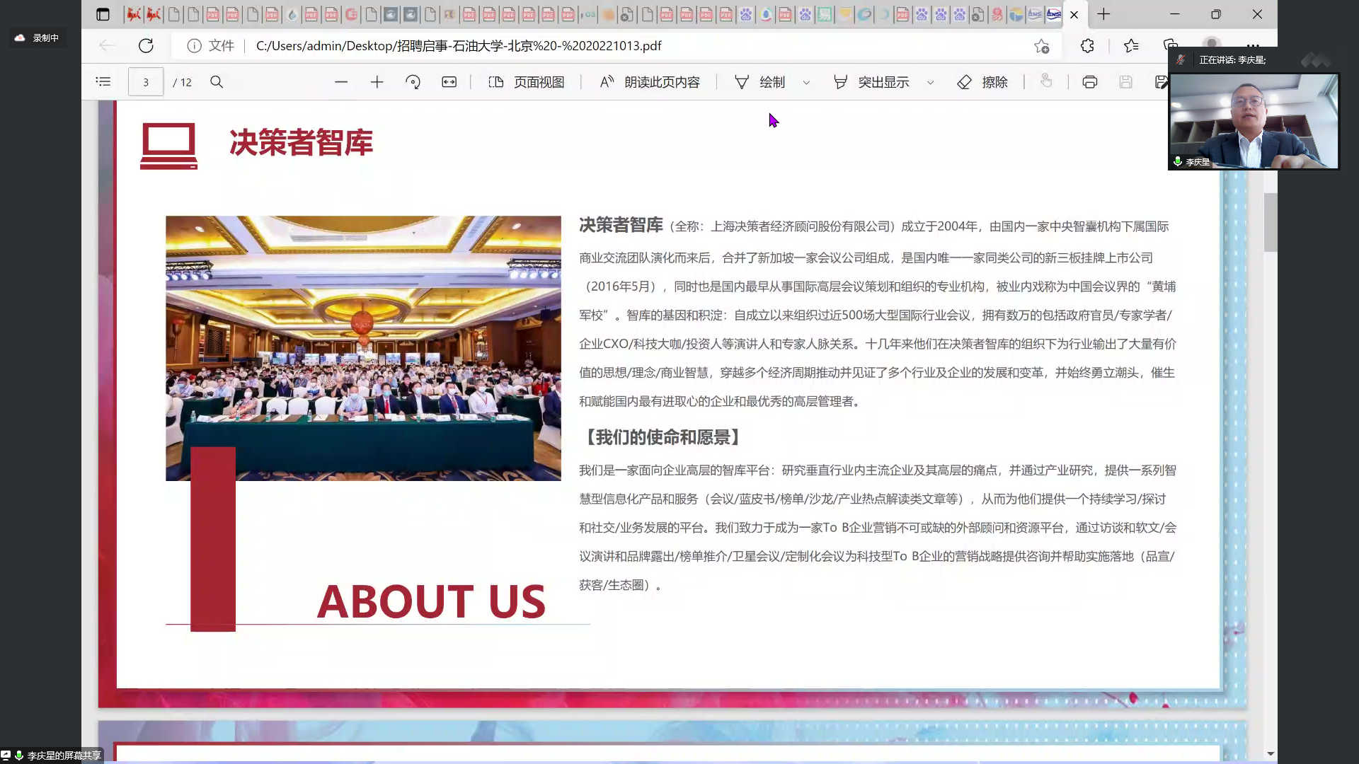 李庆星从企业规模、主营业务、使命愿景三个方面介绍了公司基本情况,为大家展示了公司与海洋油气和海洋工程相关的系列品牌会议,详细介绍了本次招聘的岗位要求及薪资待遇。李庆星与人力资源部门负责人共同就简历投递方式、基本能力要求、工作保障、职业发展等同学们关心的问题进行了解答。