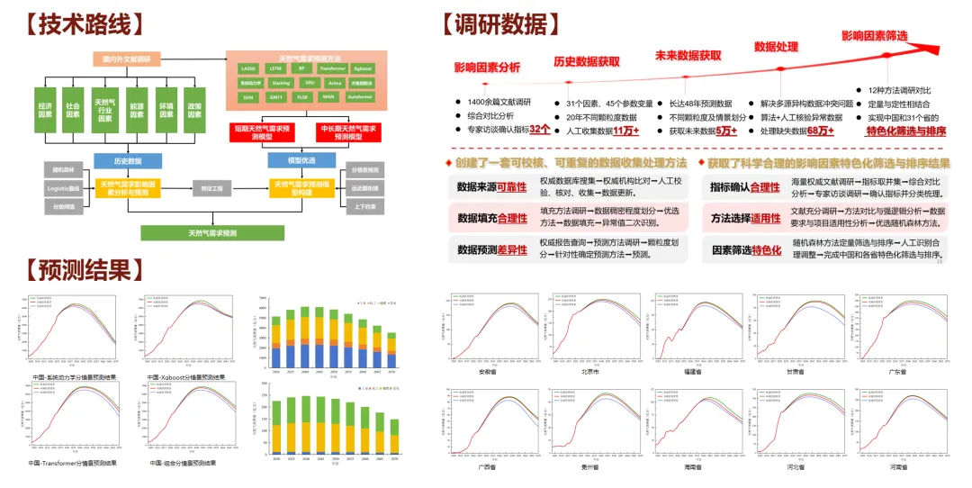 会上,实践团成员邵璇娅展示成果:“团队累计收集17万条多源权威数据,处理30万条、预测65万条数据,成功搭建百万级天然气需求数据库,探索出多情景的中长期能源需求预测路径,实现对全国、30个省、332个市、394个县四级尺度的能源需求总量与结构精准预测。”这支由青年党员主导的团队,充分发挥经管专业优势,创新研发出多模型融合预测体系。“我们创新性地将碳排放强度等政策目标转化为模型可解析的特征变量与约束条件,实现政策目标的量化嵌入与动态模拟。”实践团成员蒋卓翔补充道。通过多情景模拟,团队为“全国一张网”的规划提供决策支持,彰显数据赋能战略价值。