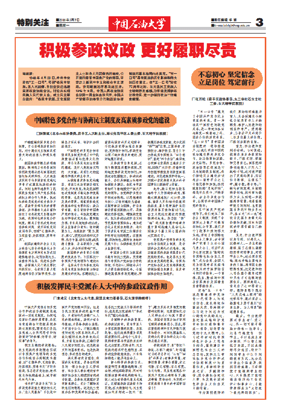 5月7日,校报以专栏形式刊发了张强斌撰写的《中国特色多党合作与协商民主制度及高素质参政党的建设》、李术元撰写的《积极发挥民主党派在人大中的参政议政作用》和张万松撰写的《不忘初心坚定信念,立足岗位笃定前行》三篇征文,为此次征文活动画上了圆满的句号。