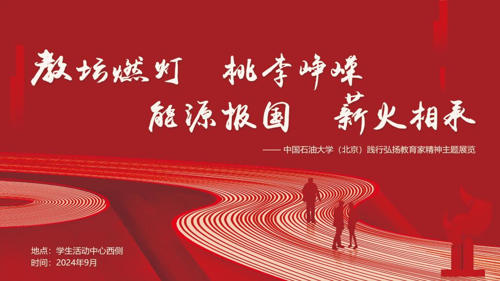 教坛燃灯,桃李峥嵘。为深入贯彻落实习近平总书记关于教育的重要论述,大力弘扬和践行教育家精神,在迎来第40个教师节的金秋时节,中石大举办“教坛燃灯,桃李峥嵘,能源报国,薪火相承”践行弘扬教育家精神主题展览。9月10日,主题展览在学校学生活动中心西侧正式开展。