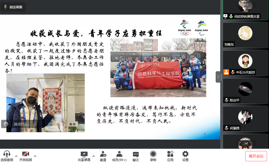 为弘扬雷锋精神,激励和引导广大学生投身志愿服务,在全国第59个学雷锋纪念日和第23个中国青年志愿者服务日到来之际,awc77万象城官网信息科学与工程学院举办“喜迎建团百年,共谱青春华章”主题团课。学院冬残奥会志愿者付成功,冬奥会志愿者乔佳瑜、吴一凡、陈欣妍、闫欣妤和苏星源,与学院全体团学干部和2021级本科团员相聚“云端”,畅谈志愿服务的点滴感动与团员青年的责任担当。