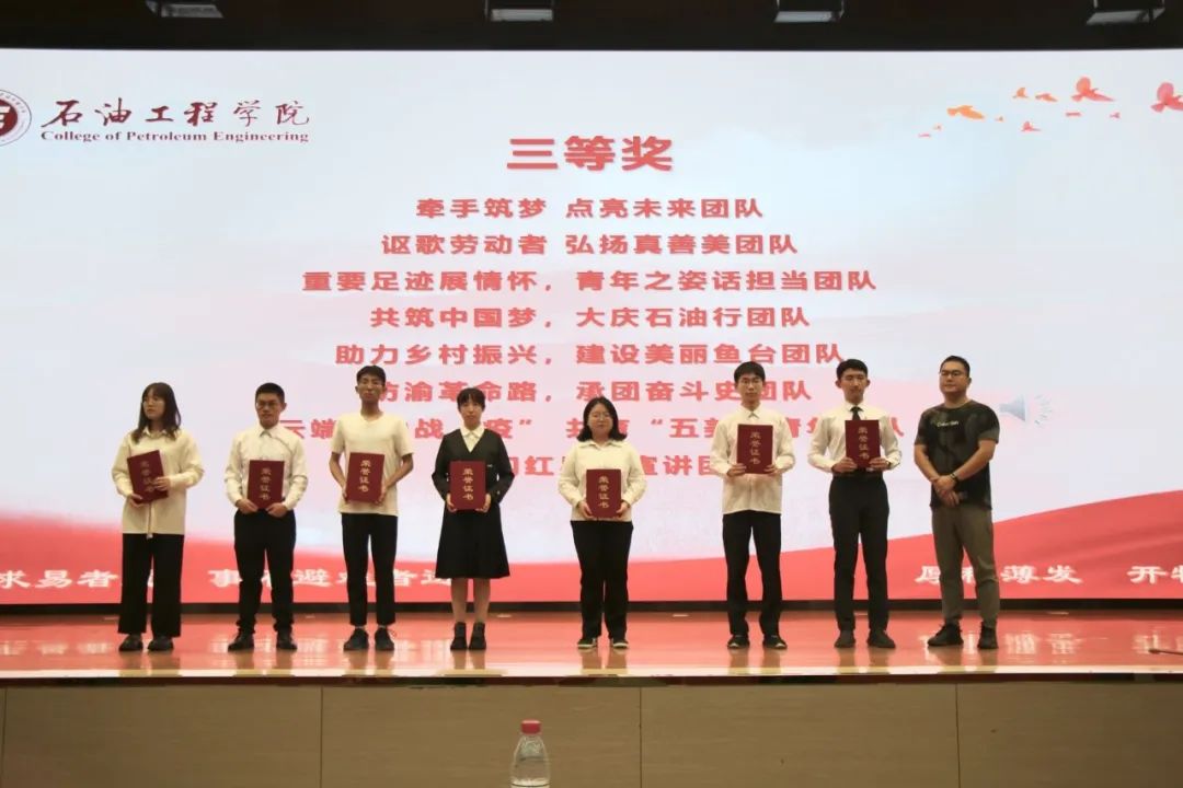 2022年暑假,石油工程学院组织开展第四期“铁人精神训练营”,学院青年学生积极投身社会课堂,将小我融入大我,把青春献给祖国,取得了良好的育人效果和积极的社会反响。经评比展示,涌现出16支优秀团队。在“领航·表彰”环节,刘东东宣读社会实践优秀团队表彰决定,研究生工作部副部长张松为获奖团队代表颁发证书。