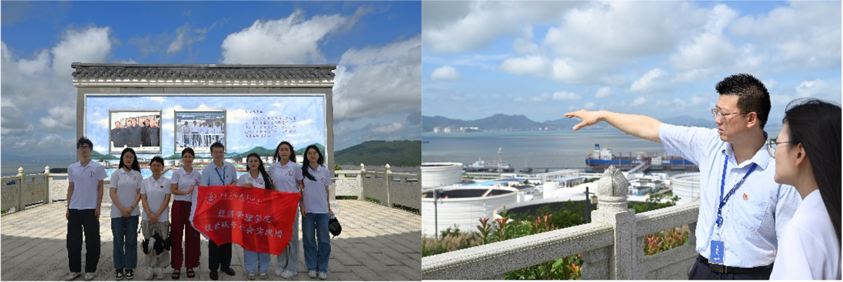 岙山基地是祖国东海之滨的能源重镇。实践团在中化兴中石油转运(舟山)有限公司人力资源部主任金翀略的带领下登上岙山望远亭,俯瞰石油储备基地全貌。在望远亭,金翀略详细讲解了基地的概况和发展历程以及未来发展方向。昔日一片滩涂的悬水小岛,成为如今大罐林立、管道纵横的世界级“石油岛”。