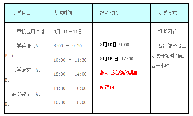 (1)《计算机应用基础》、《大学英语》(A、B、C)、《大学语文》(A、B)和《高等数学》A、B)四门统考课程全部采用混编考场方式。报考时间如下: